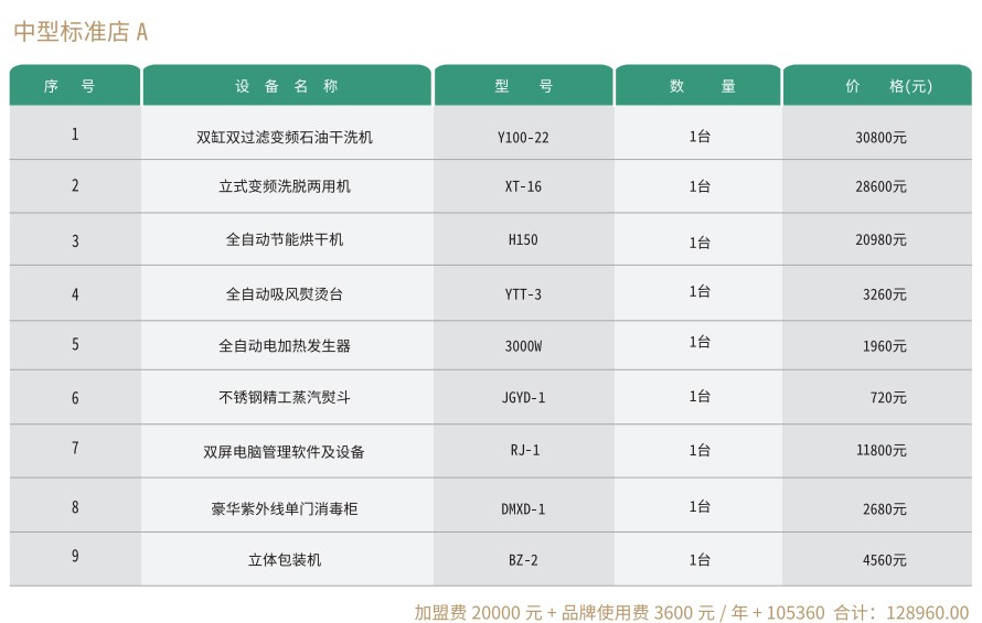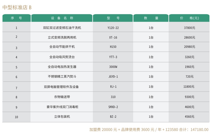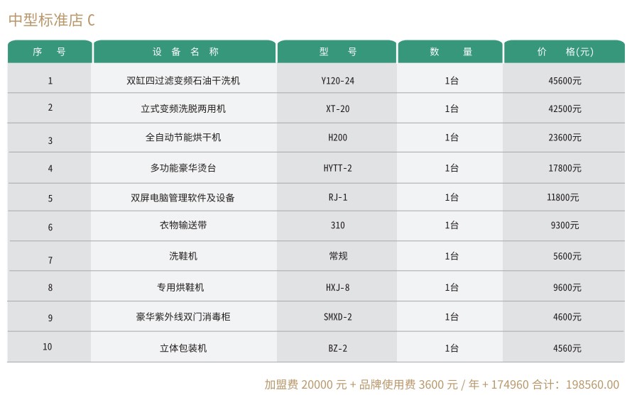 赛维洗衣标准店有三种投资方案,适合一般的投资者,资金适中,业务面够用。